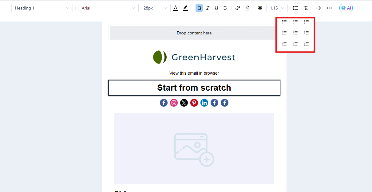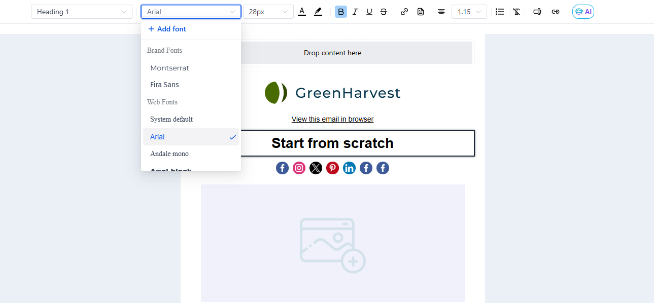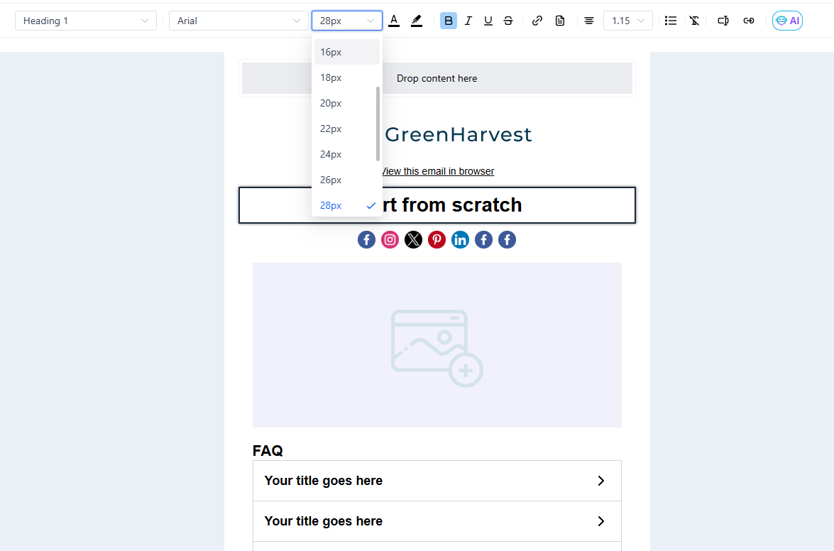 Section titled “Leveraging “What You See Is What You Get” (WYSIWYG) Editing”This editor operates on the principle of WYSIWYG, providing real-time previews as you make changes. Whether it’s bolding a sentence, inserting an image, creating an image through AI, or changing the color of a heading, the editor displays the final email appearance instantly.