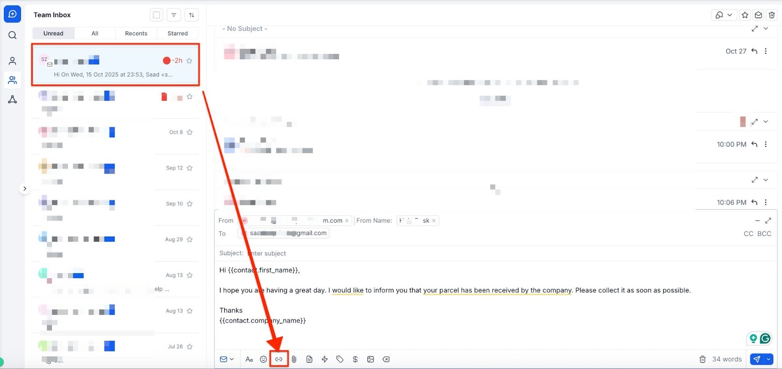Alternatively, navigate to “Conversations” to view a specific conversation, and select the email tab. Click on the icon at the bottom of the screen to add a Trigger Link.