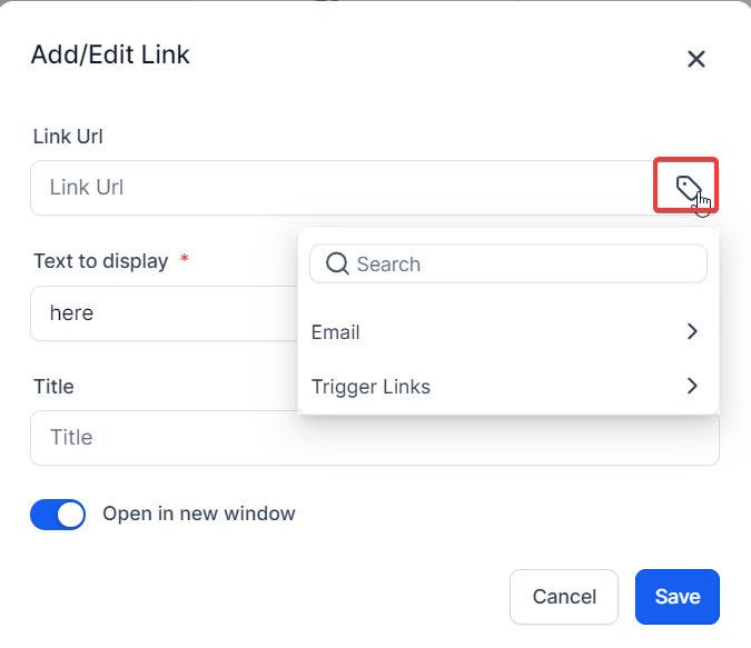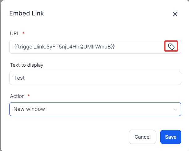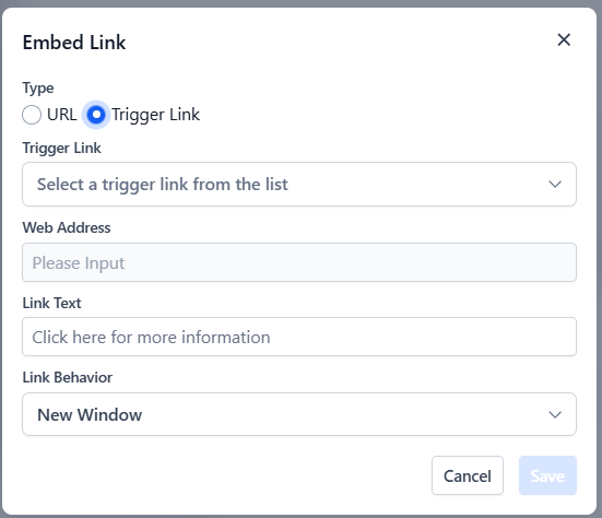 - Select the trigger link from the dropdown, and it will auto-populate the URL value. Edit as preferred