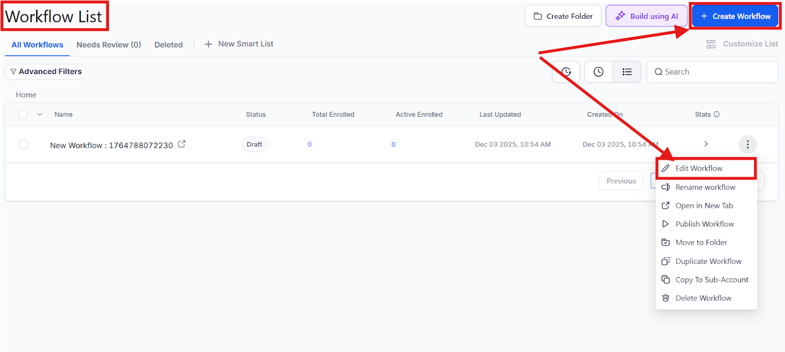 Section titled “Part 2: Using Trigger Links from Workflows”- Navigate to Automation > Workflows and hit the “+ Create Workflow” button or edit an existing workflow