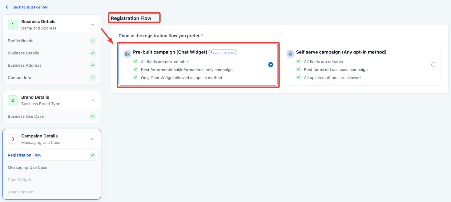 Pre-Built A2P Campaign (Widget-First) Registration Flow