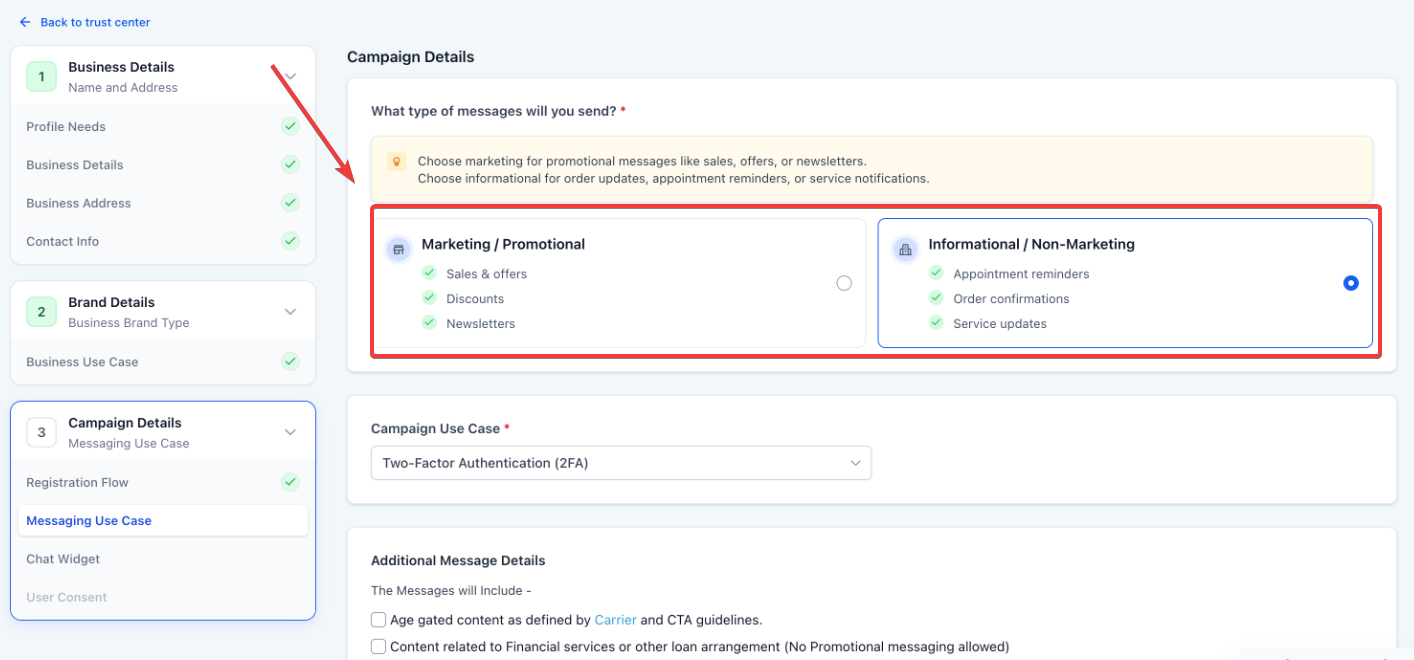 Select Your Message Intent: Decide if your messages are for Marketing (promotions) or Informational (updates and alerts) purposes.
