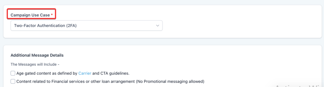 Streamlined Selection: Users are guided through a filtered dropdown of use cases such as Customer Care, 2FA, or Marketing ensuring the messaging intent is clearly defined.