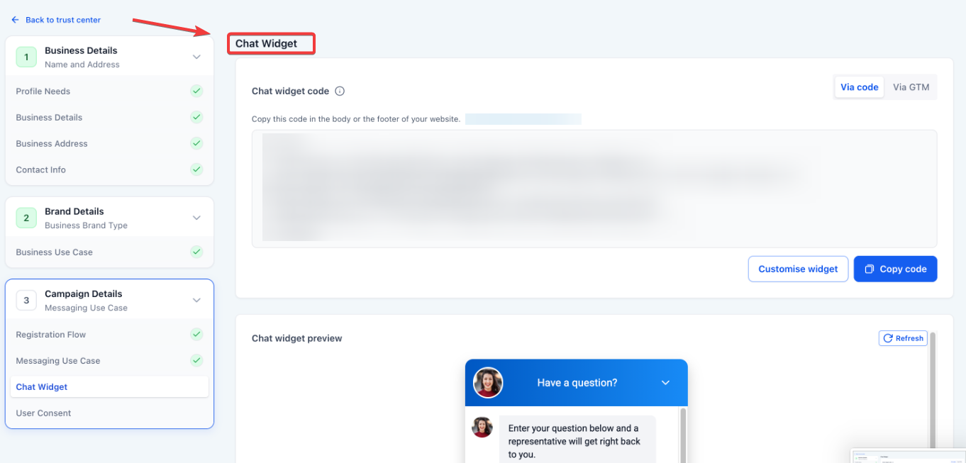 Check Your New Widget: Look at the preview of the chat widget the system built for you. It already includes your business name and the required legal language (like how to “STOP” or get “HELP”).