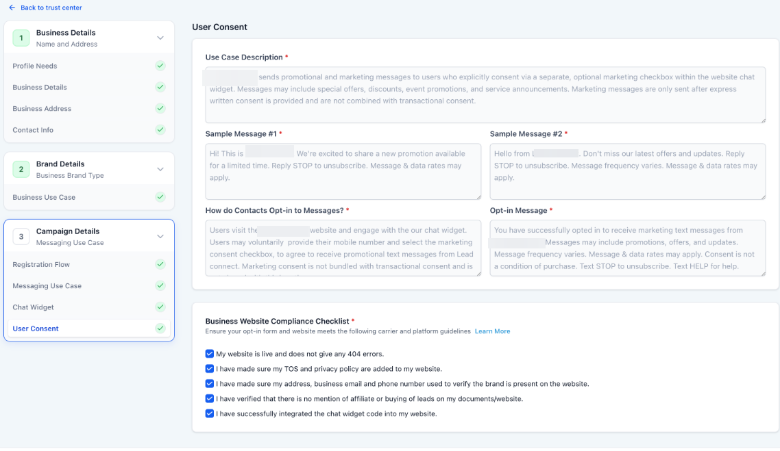 The purpose of this article is to describe the specialized registration experience designed for users to streamline the Application-to-Person (A2P) messaging compliance process. This feature minimizes manual effort and reduces the risk of carrier rejections by enforcing a pre-configured, high-compliance registration path focused on the chat widget as the primary opt-in method.
