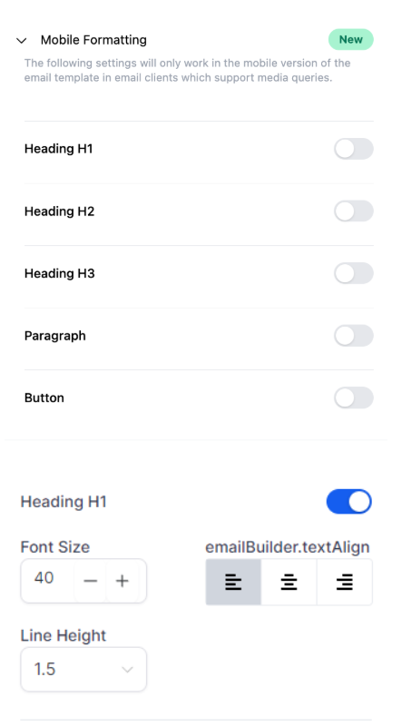 - Under Mobile Formatting, customize the options for font height, styles, and alignment. To view these enable any toggle that you would like to edit for Heading H1, Heading H2, Heading H3, Paragraph, and Button