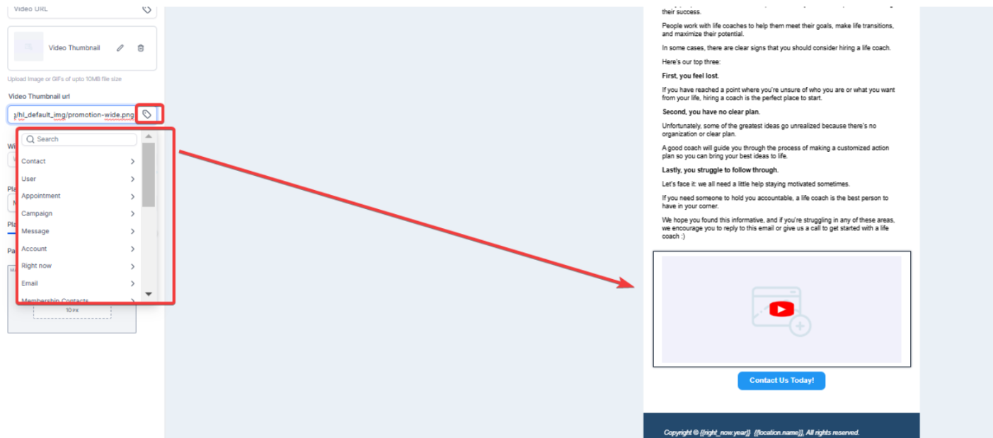 Question: Can I customize the video thumbnail image in my email template? Answer: Yes, if the default thumbnail image doesn’t display correctly or if you’d like to use a custom image, you can manually provide your own thumbnail image URL.