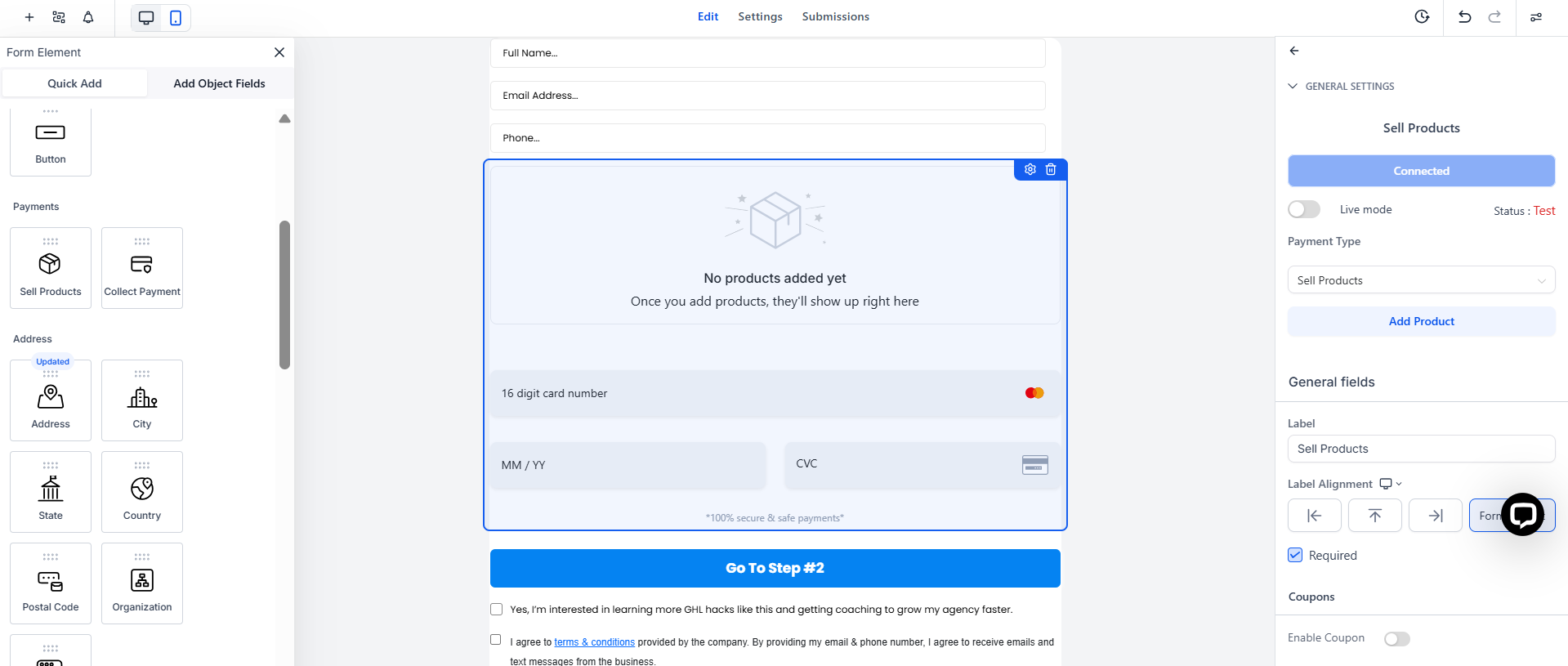 - Drag and drop the Sell Product element onto your form canvas.