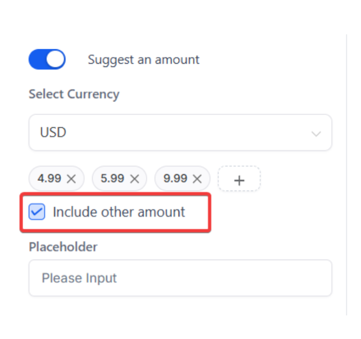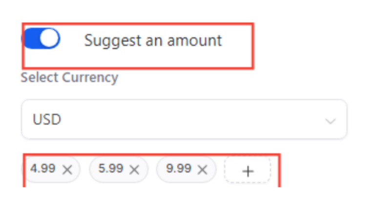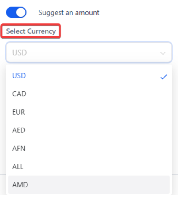 3. Suggest an Amount:** - Enter specific donation amount options and add as many as you want. This allows users to select a suggested amount directly.