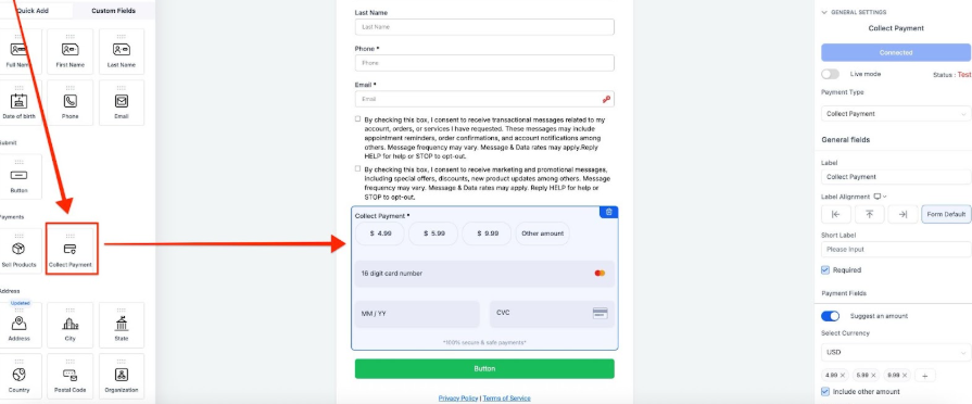 2. Payment Type:** - Collect Payment: Choose this option to collect a specific amount.