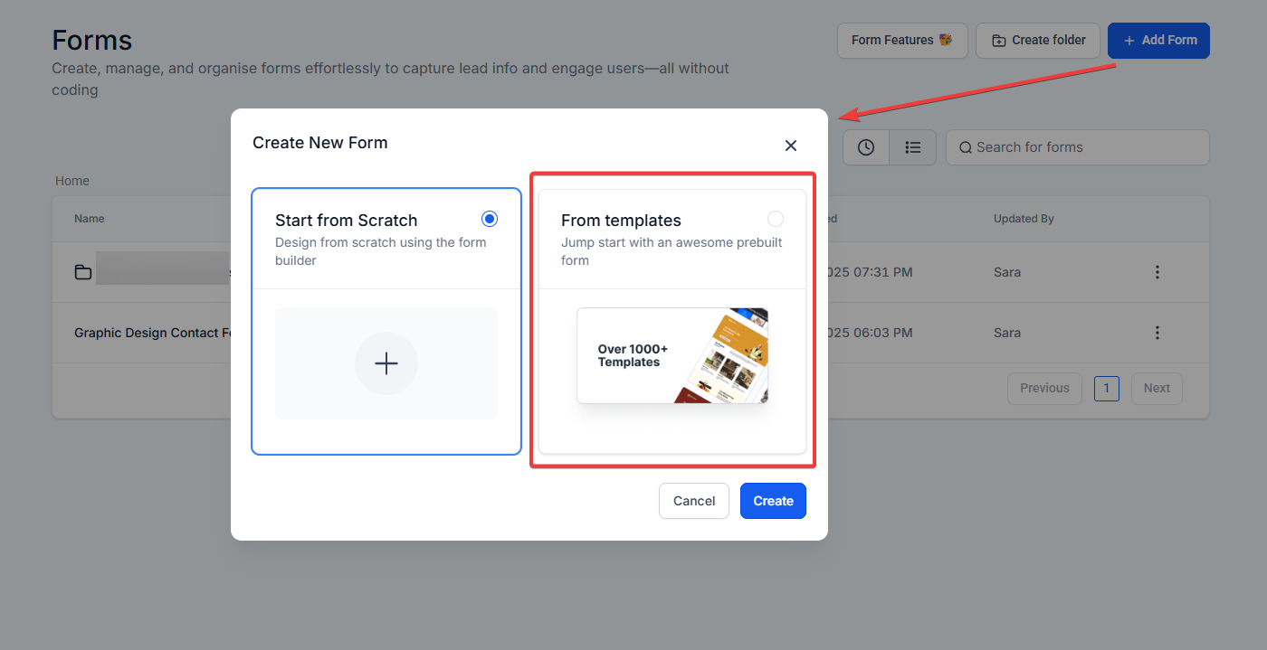 Question: How do I access the Template Library? Answer: Navigate to Sites > Forms > Builder and click on ”+ Add form”. Then select “From Template”.