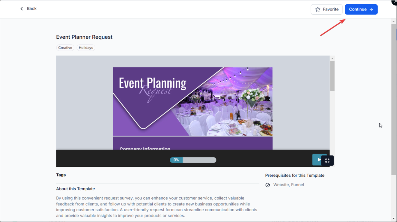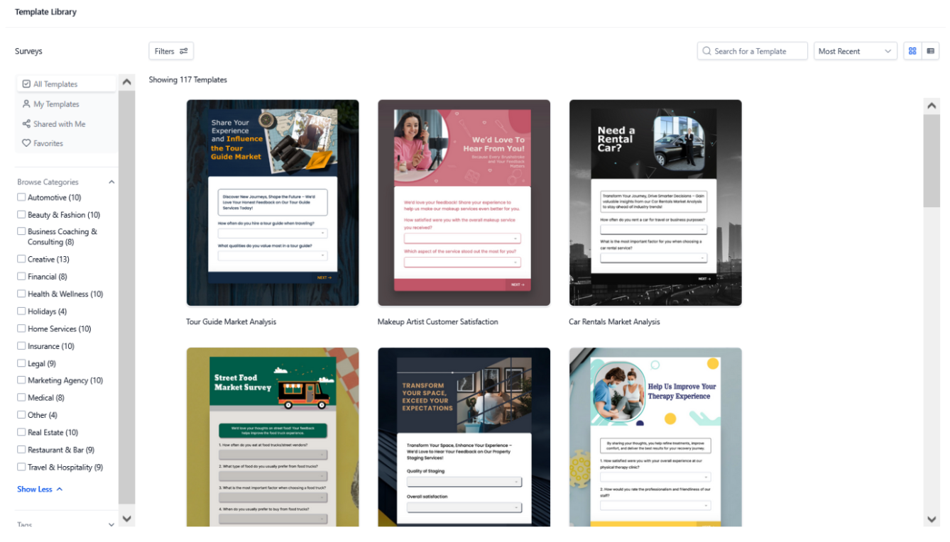 Section titled “Selecting a Template:”- Choose a survey template by filtering for a specific category, click on the template you like, and then click on the “Continue” Button.