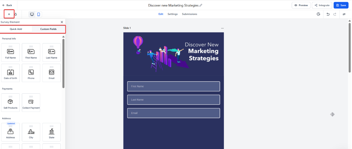 Question: How do I save and use my customized survey? Answer: Once you’ve finished customizing your survey, click on “Save” to save your changes. You can then click “Integrate” to embed the survey on your website or funnel, or obtain the Iframe Embed Code or link to share with your leads.