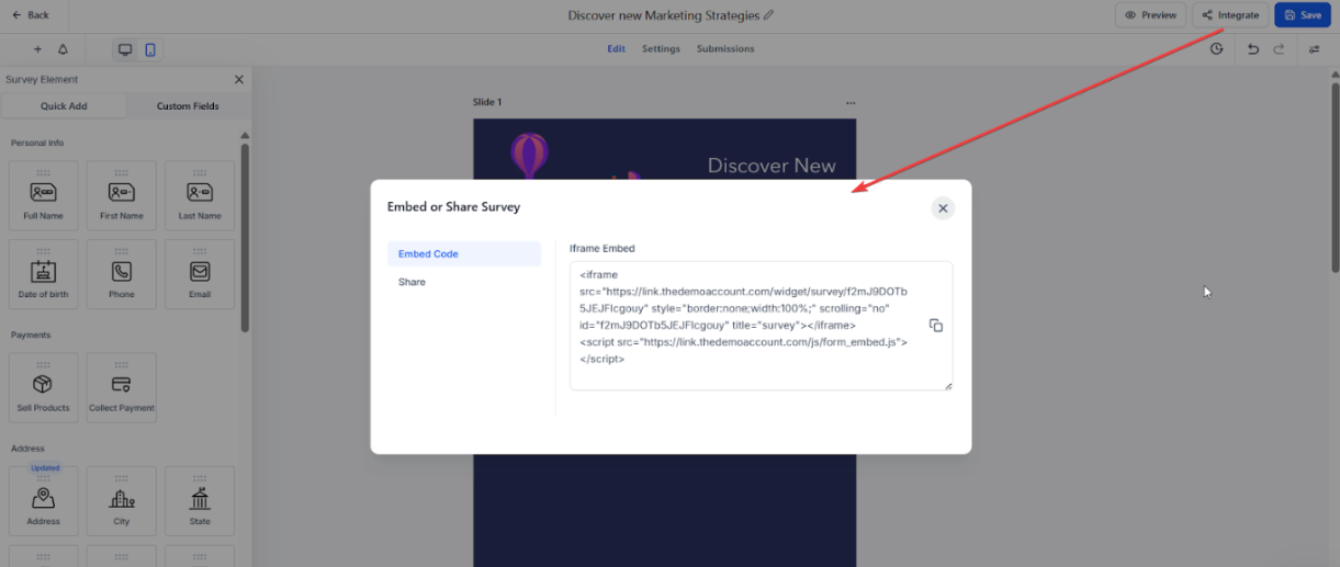 - You can click on Integrate to embed the form on your website or funnel and get the Iframe Embed Code or the link to the survey so you can share it with your leads.