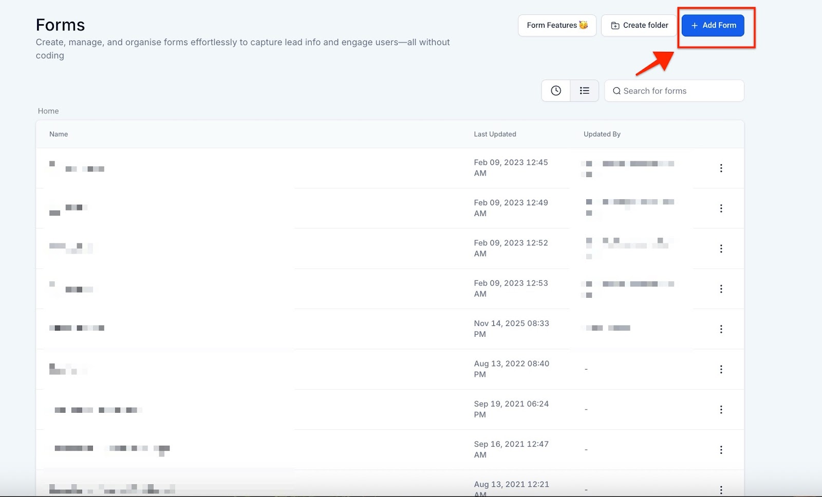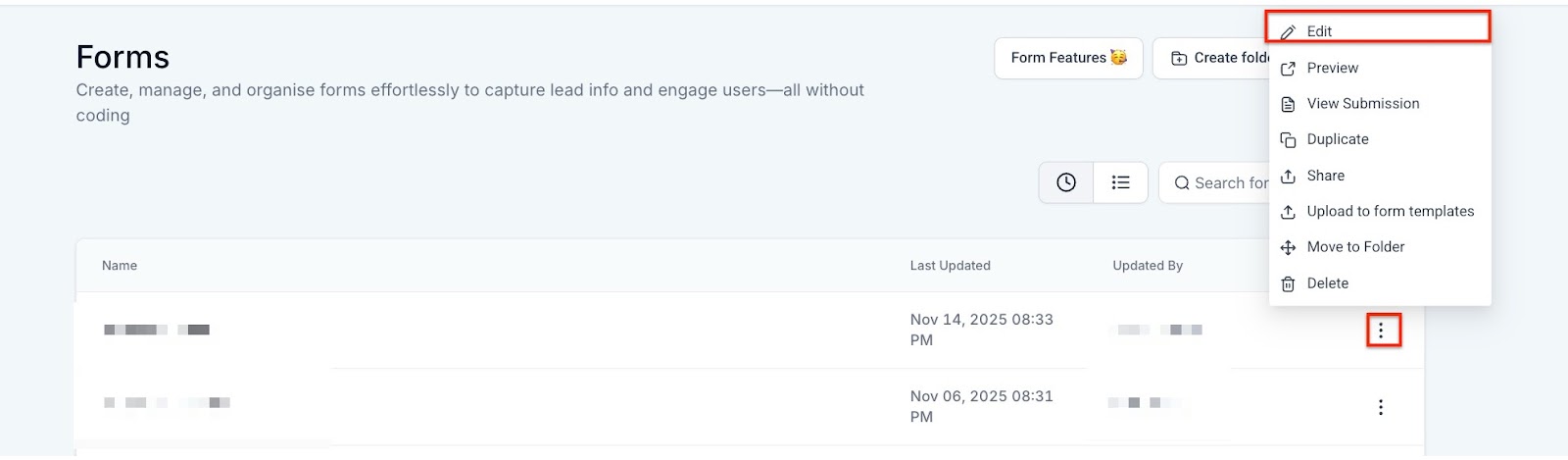 Section titled “3. Add a New Form or Edit an Existing One”- Create a new form or choose to edit an existing form.