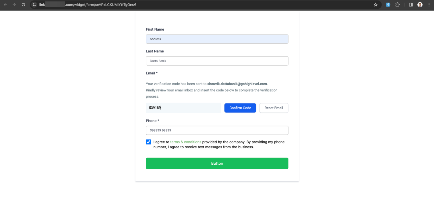 Answer: When the feature is enabled, a “Verify Email” button will appear within the email field. After the user types their address and clicks the button, the system sends an OTP (One-Time Password) to their inbox, which they must enter into the form to complete the verification.
