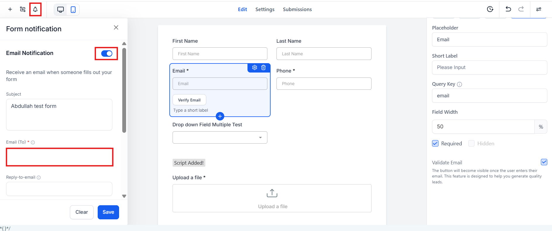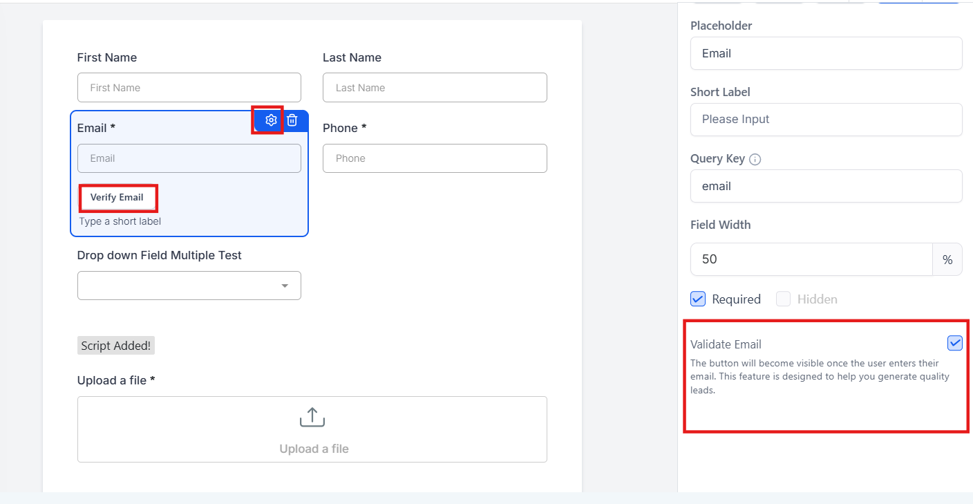 - Enable this option to activate email address validation for the field. This will display a Verify Email button on the email field.
