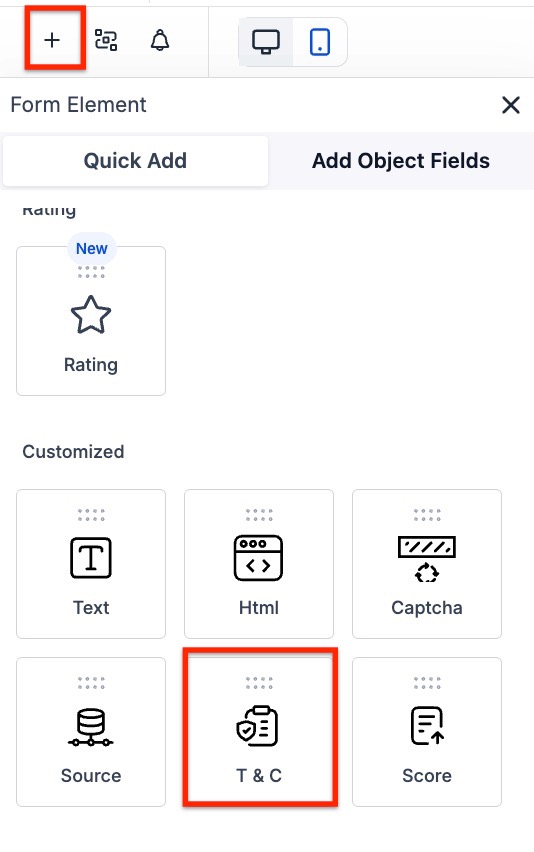 - Locate the Terms and Conditions field within the form builder options. Simply click and drag the element to the desired position within your form.