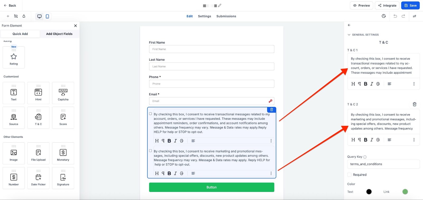 Question: How do I customize the Terms & Conditions text? Answer: You can edit both the Transactional and Promotional T&C text directly in the form editor to meet your business and compliance requirements.