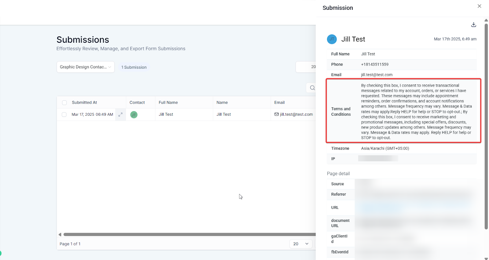 4. Submission Recording for Compliance: Consent choices recorded in the “Terms & Conditions” column in the submission table.