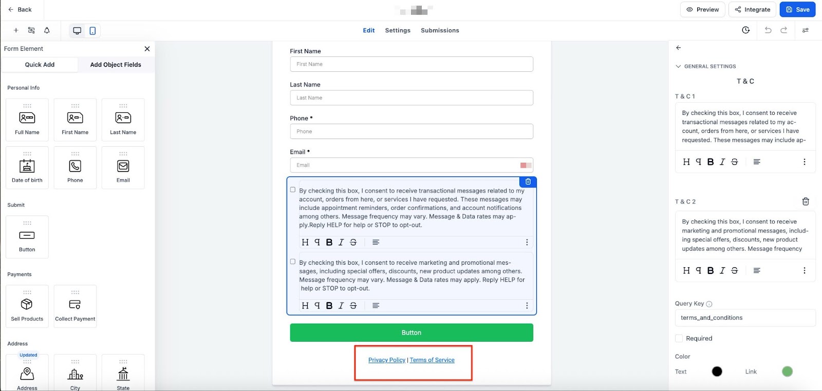 - Text Elements: Separate text elements containing links to the Privacy Policy and Terms of Service will be automatically included when a phone element is added to the Form/Survey Builder.