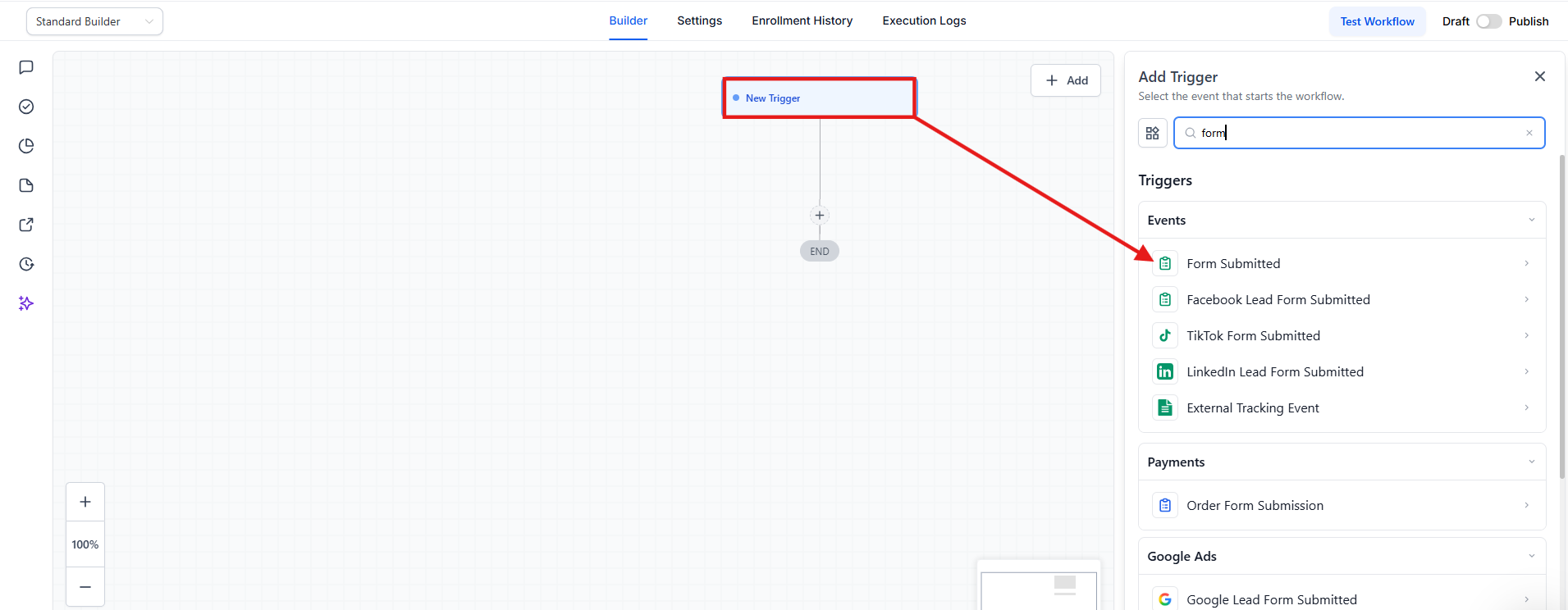 Section titled “Step 4: Setting up the workflow Trigger”- Click on “Add New Workflow Trigger”