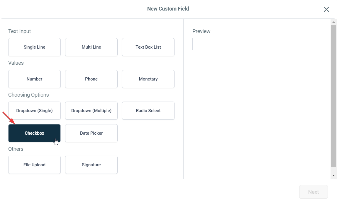 - A window will appear. Select “Checkbox”