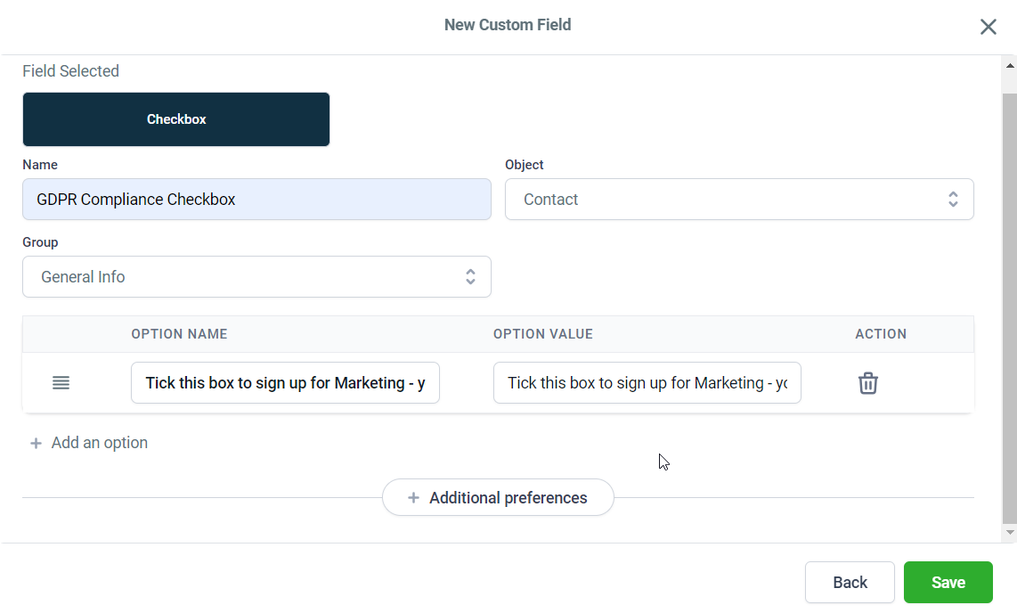 - Give the field a name, such as “GDPR Compliance Checkbox.”
