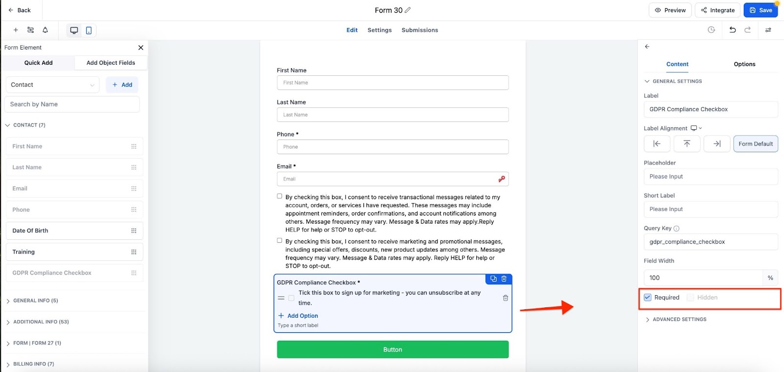 Section titled “Step 2: Making The Checkbox Field Required”- Drag and drop the GDPR checkbox custom field to the form.