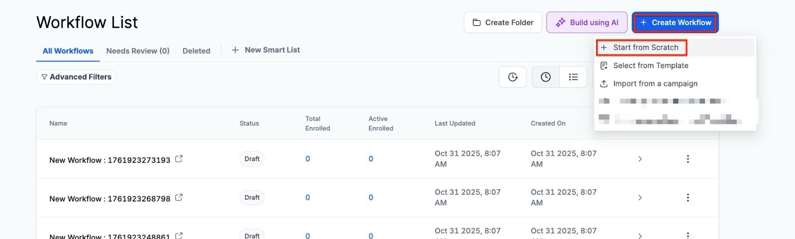 Section titled “Step 3: Creating a GDPR Workflow ”- Navigate to the workflow panel, click “Create a new workflow” at the top right, and select “Start From Scratch.”