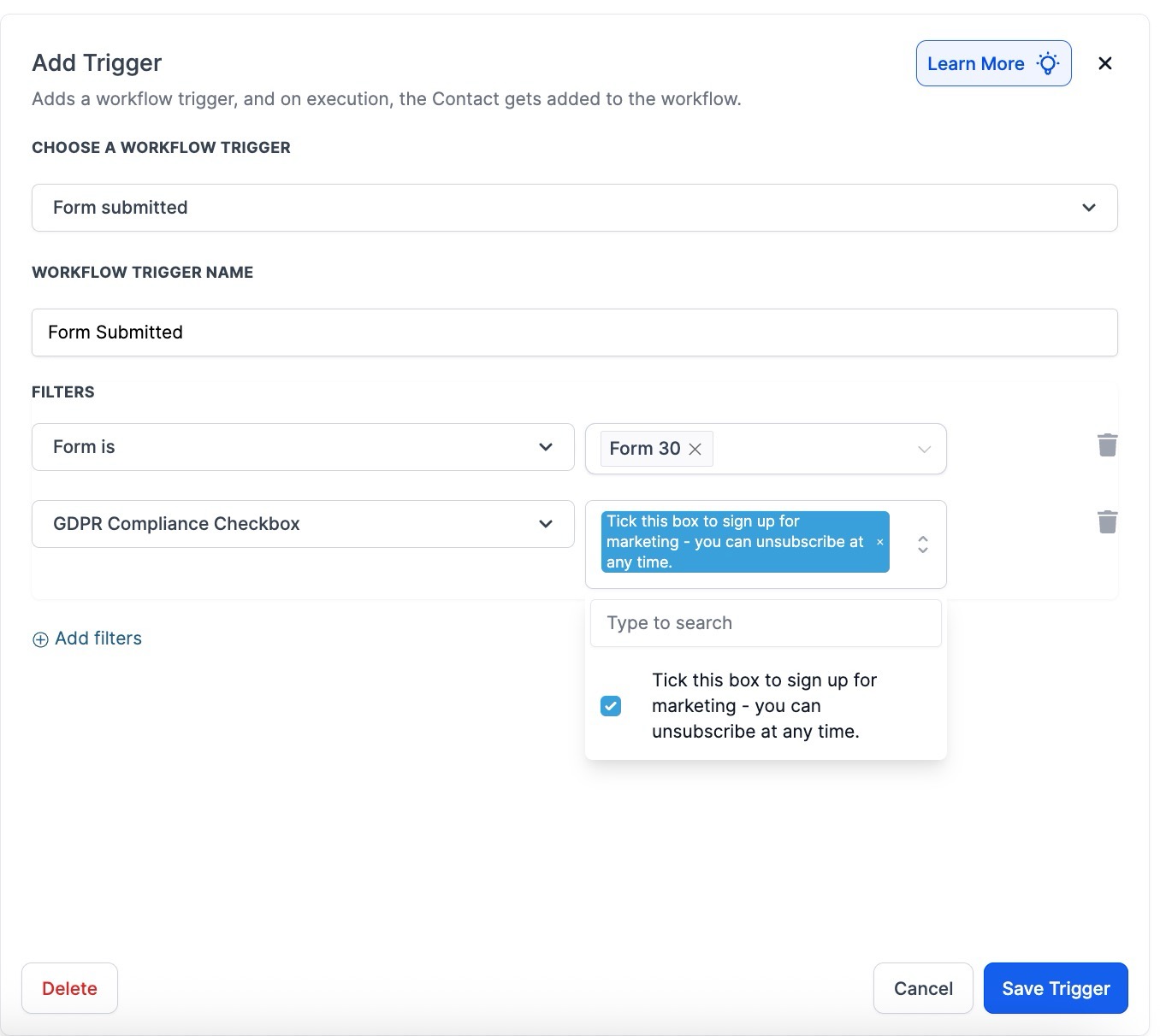 The Custom Checkbox element in Form Builder will allow visitors to confirm their consent to receive information from your/your client’s business. This is useful for visitors in countries that require additional consent for GDPR compliance.