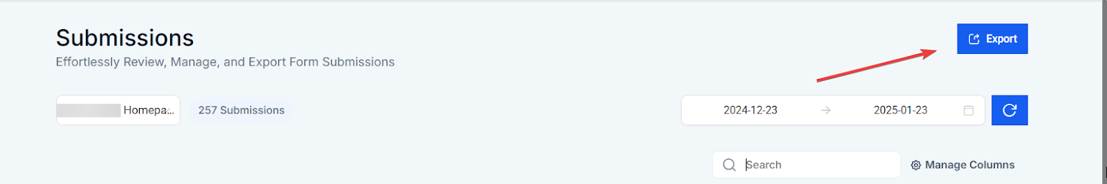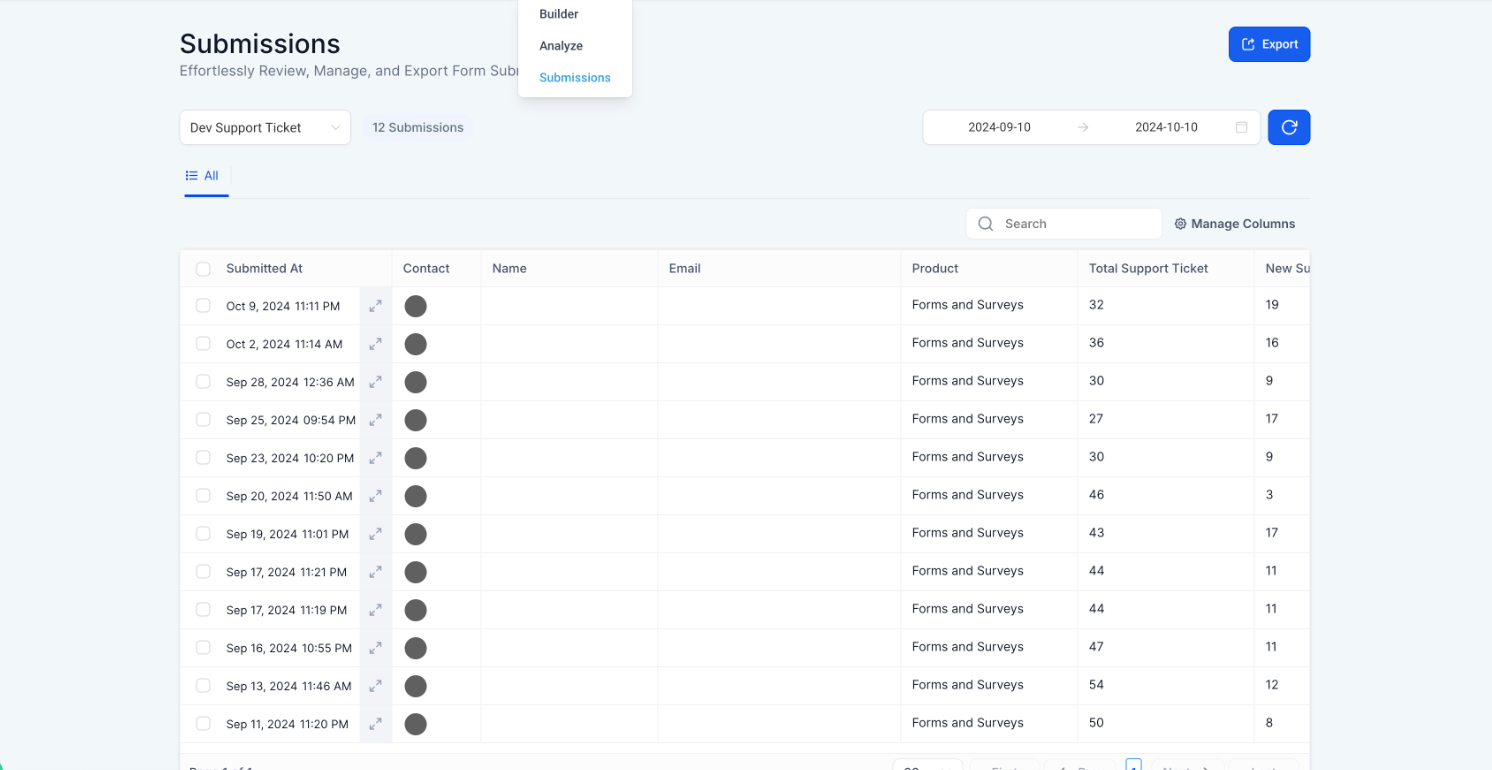 Section titled “Step 4: Export Submissions”- To export submissions, click the Export button at the top-right.