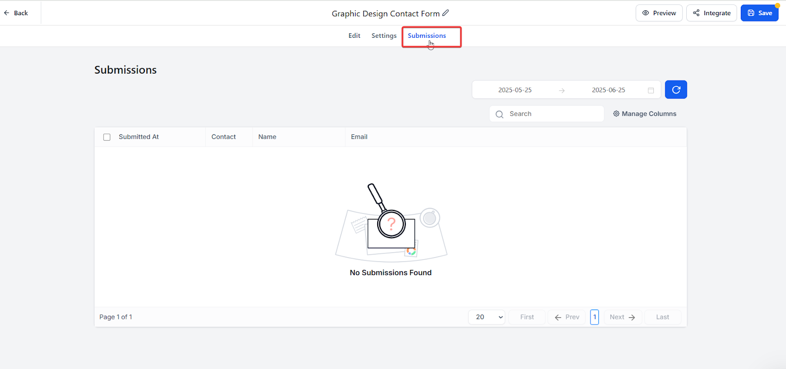 - Use the Search Bar to locate submissions using name, email, phone, or contact ID.