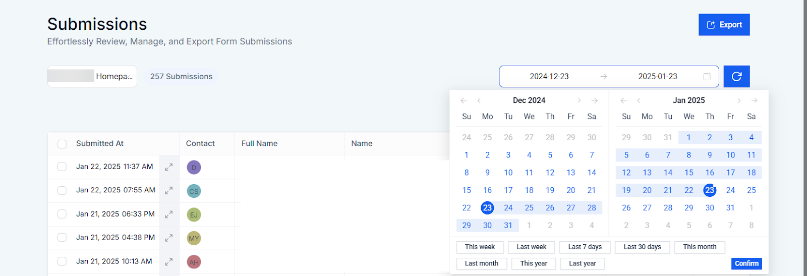 Section titled “Step 2: Filter and Search Submissions”- Use the Date Picker in the top-right corner to filter submissions by specific timeframes.