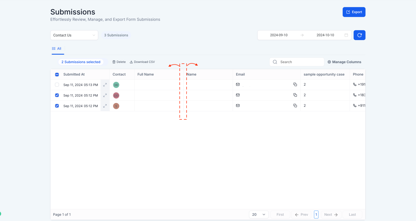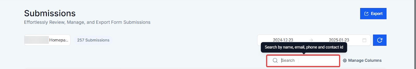 Question: How can I filter submissions by date range or specific fields? Answer: To filter submissions by a specific date range, use the Date Picker located at the top-right corner of the Submissions page. Additionally, you can search for submissions by specific criteria such as name, email, phone number, or contact ID using the Search Bar.