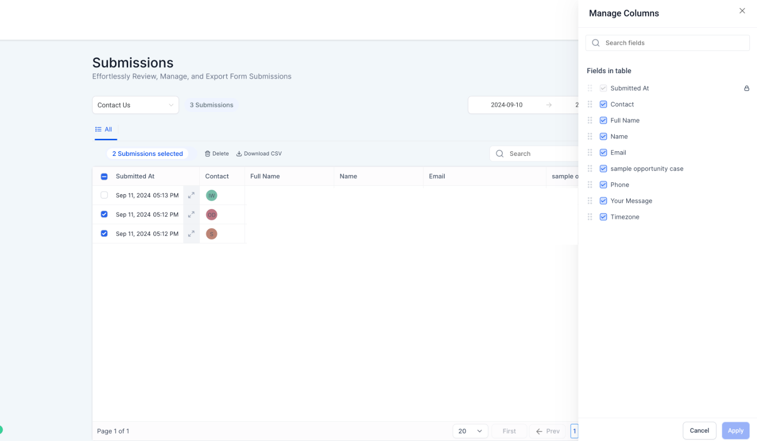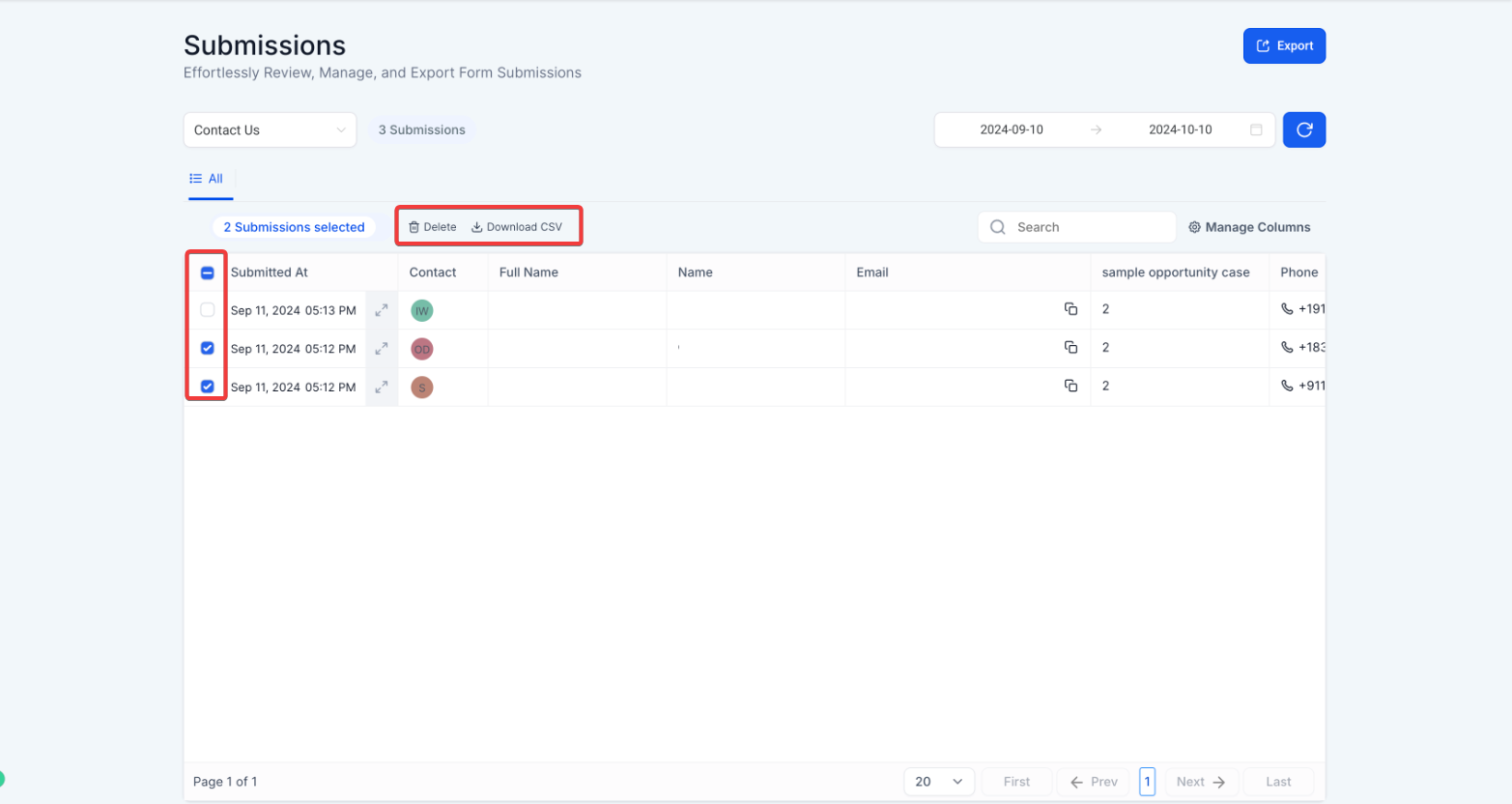 Section titled “Step 6: Download or delete the submissions”- Select form submissions to download (in CSV format) or delete entries.