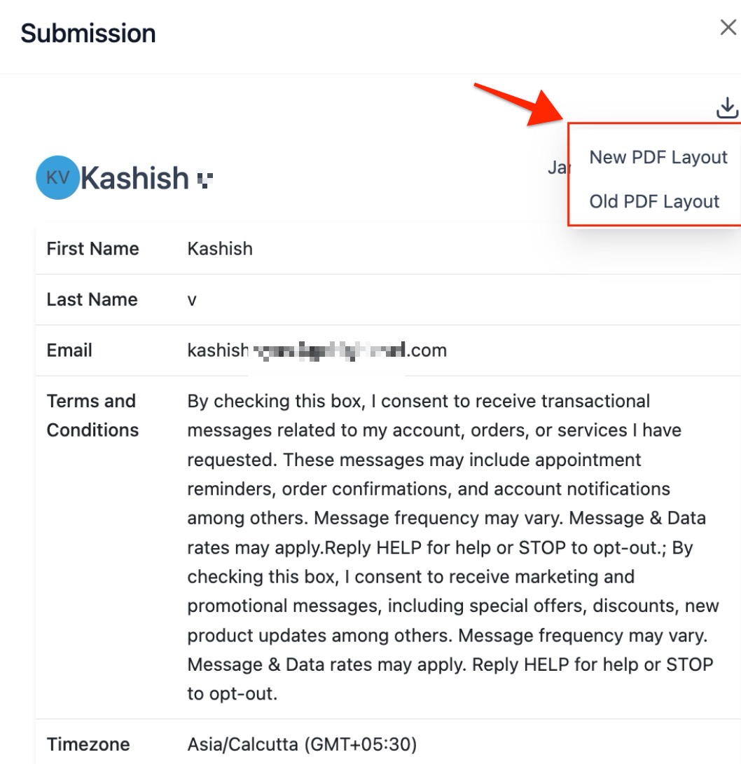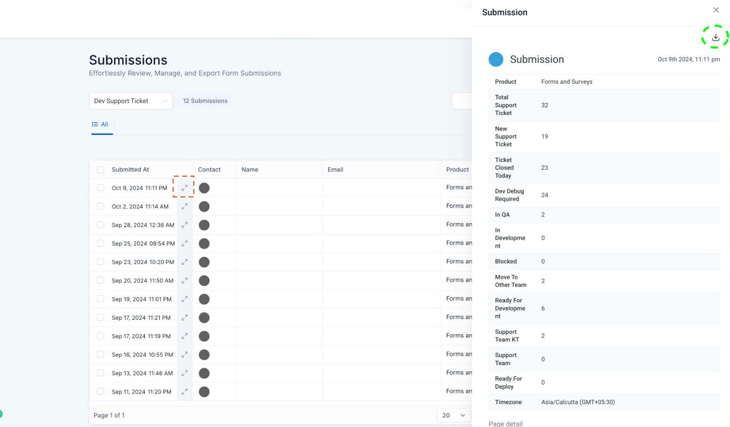 Question: Can I download an individual submission as a PDF? Answer: Yes, click on the timestamp of a submission to expand its details, and use the Download PDF option at the top-right corner.