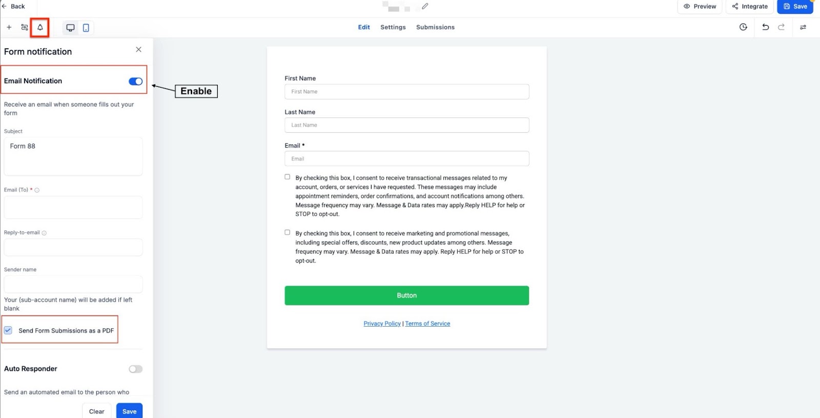 Question: How do I set up automatic email notifications for new submissions? Answer: Open the editor for your specific Form, Survey, or Quiz and click the bell icon. From there, toggle on the ‘Email Notification’ option to receive alerts whenever a new entry is submitted.