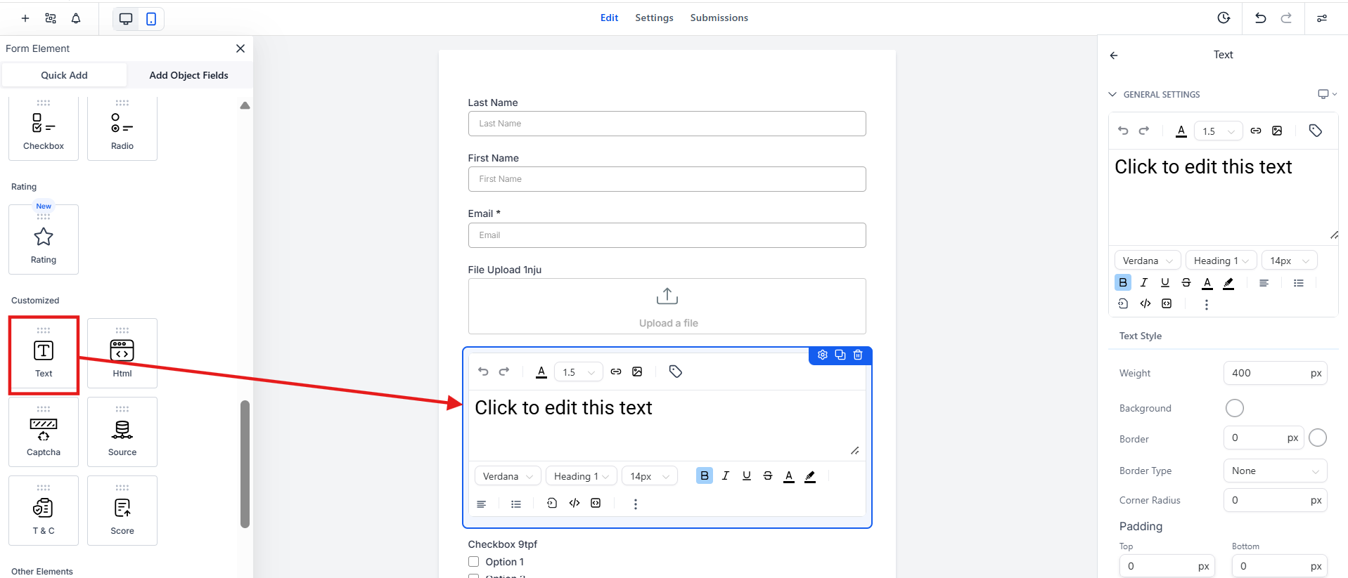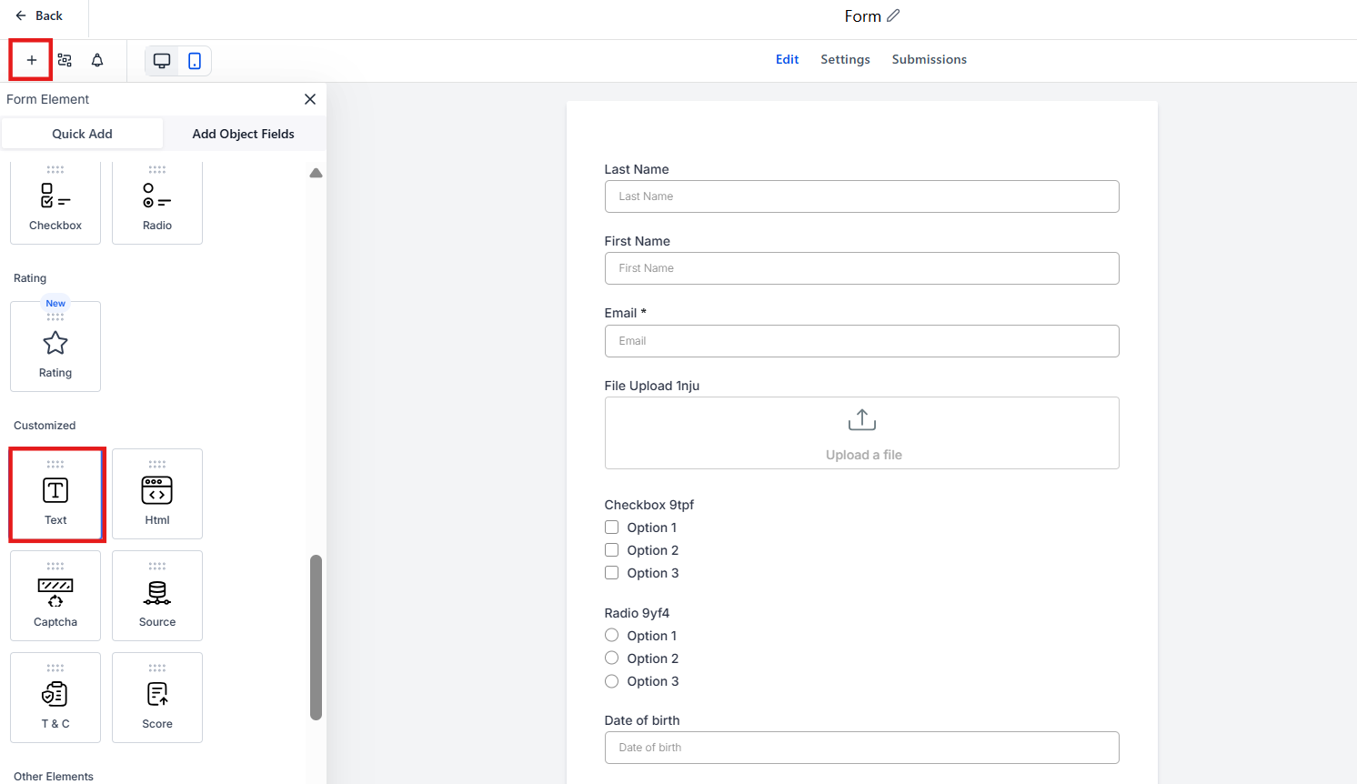Section titled “2. Add Text Element”- In the surveys builder, click on the ”+” icon to add a text element by drag and drop.