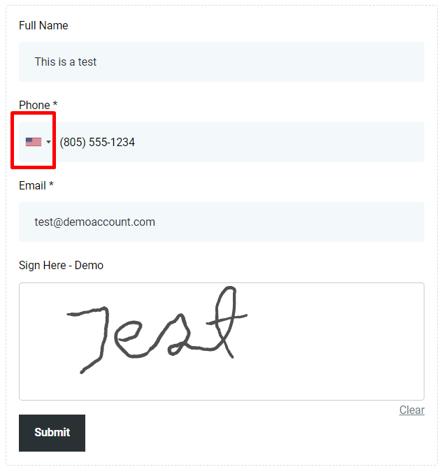 Answer: To display the flag, you must select the phone element in the Form Builder and check the box labeled “Enable Country Picker.” Once this is done and the form is saved, the flag representing the user’s location will be visible.