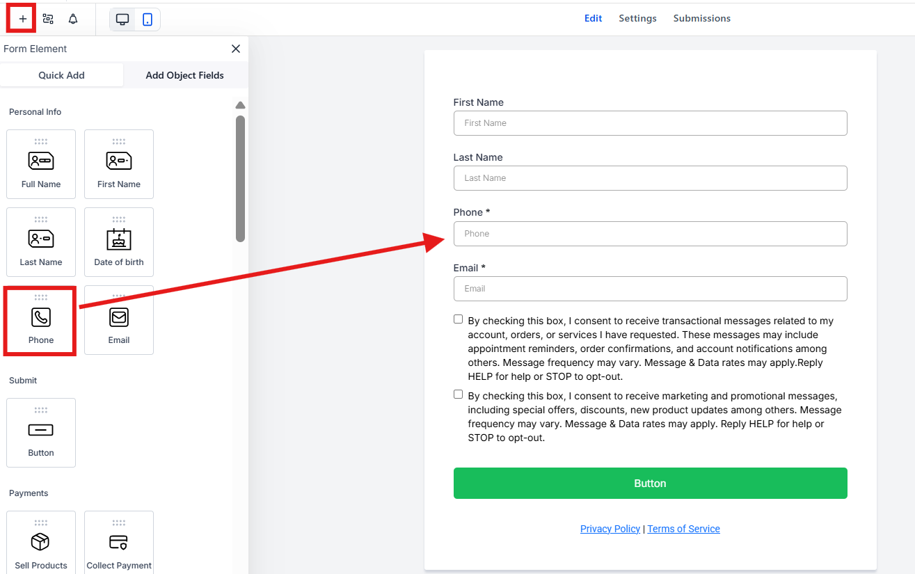 - Drag and drop the Phone field into the form using the Standard Fields on the left-hand side.
