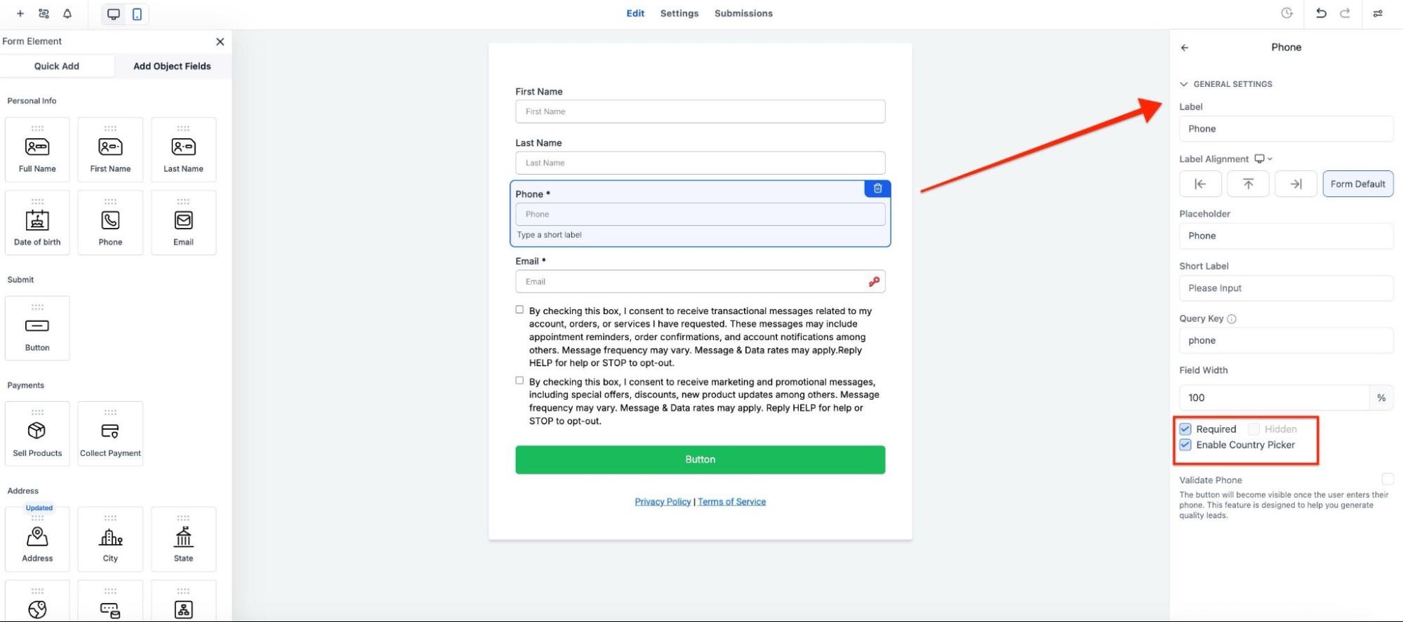 - Click on the phone element to make the settings appear on the right-hand side. From there check the box for “Enable Country Picker”