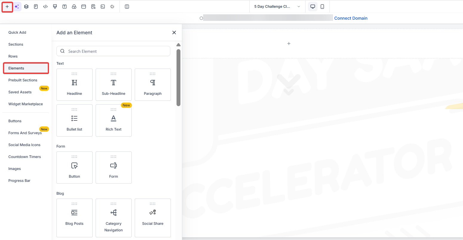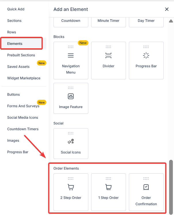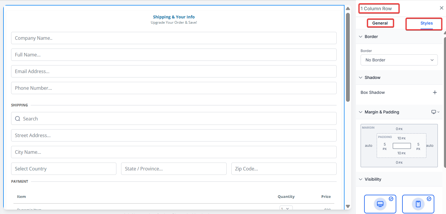 - In the side editing bar drag and drop a One (or Two) Step Order Form into the working area.