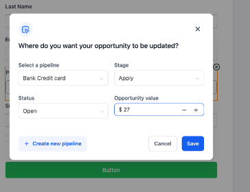 - In the settings modal, configure the opportunity settings by selecting a pipeline, stage, status, and opportunity value.