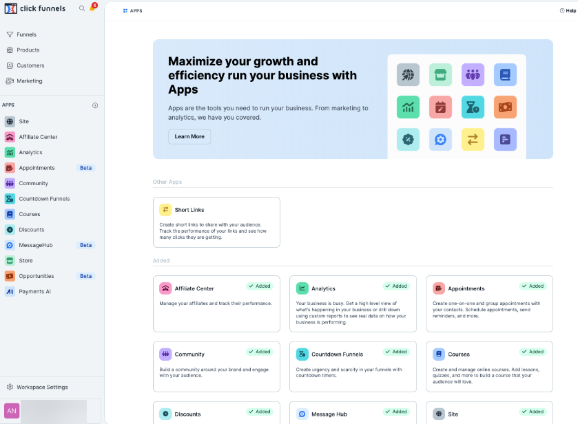 By default, the menu includes Funnels, Products, Customers, and Marketing. Users can customize their menu by adding additional apps such as Opportunities, Sites, Automation, Courses, and Store.