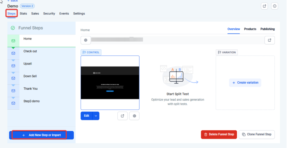 Step 1: Within the funnel or website section, click the “Add New Step” button to add a new page to your funnel or website.