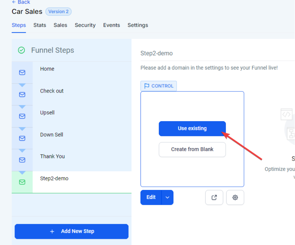 Section titled “Step 4: Click “Use Existing” to choose a funnel step or website page to import.”