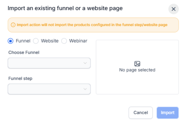 Answer: The import popup provides dropdown menus. First, you choose the category (“Funnel” or “Website”), then you select the specific name of the funnel/site, and finally, you select the exact step or page from that project.