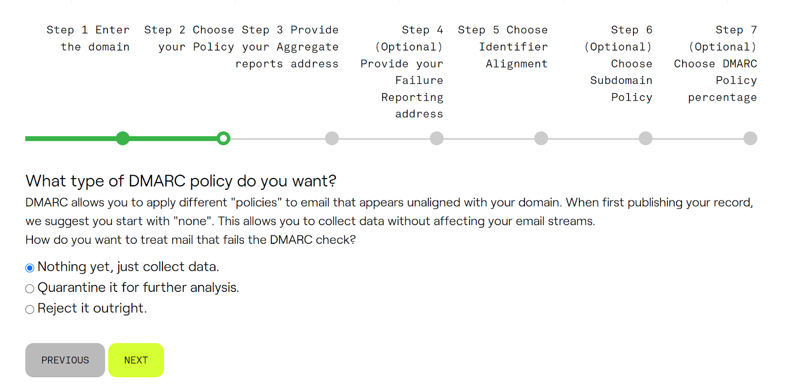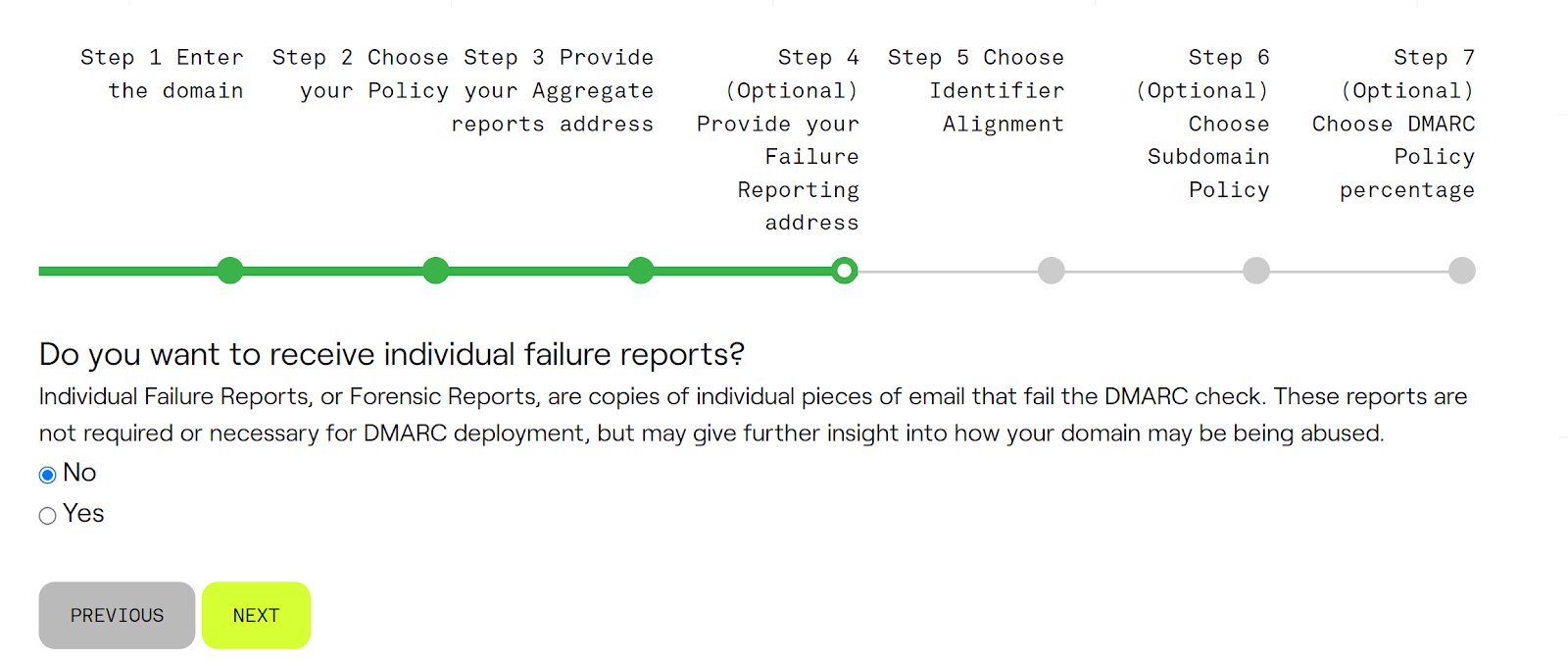 This step asks if you want to receive detailed reports for each email that fails the DMARC check, known as Forensic Reports. These are not necessary for DMARC deployment but can provide deeper insights into specific failures, which could indicate abuse of your domain. If you choose “Yes,” you’ll get these detailed reports; if “No,” you’ll only get aggregate data.