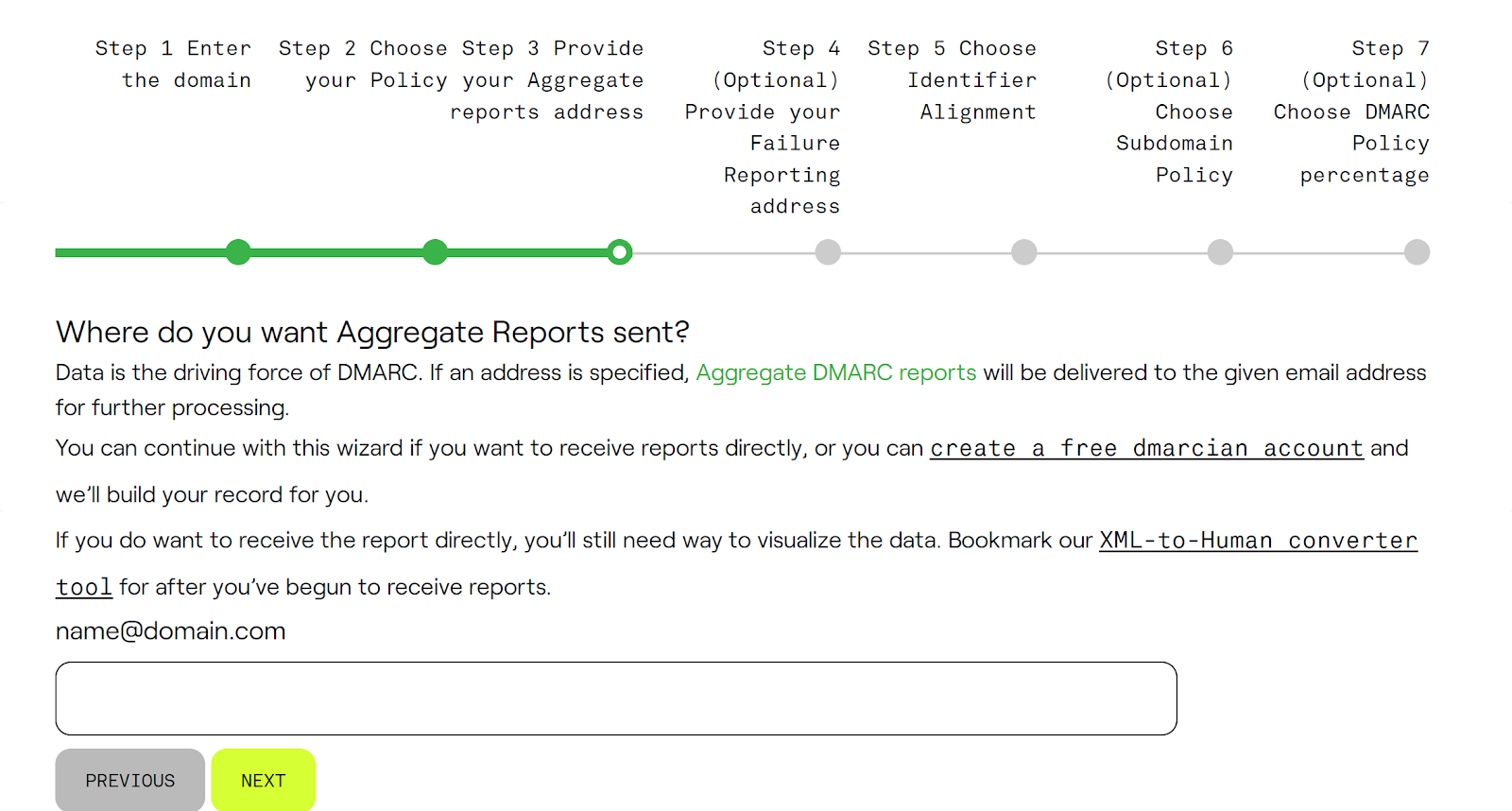 Answer: You should enter your email address in the step where the wizard asks for the aggregate reporting address. This email address will receive DMARC reports that provide insights into the emails being sent from your domain, including which ones pass or fail DMARC checks. Use an address specifically set up for handling DMARC reports, such as dmarc-reports@yourdomain.com.